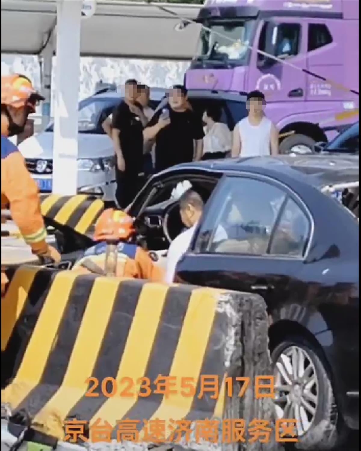 目击者申先生告诉极目新闻记者,17日下午2时30分许,他开车进京台高速济南服务区东区时看到,一辆黑色轿车停在一个混凝土防护栏边,司机被卡在车内,身上全是血。司机是一名中年男子,戴着眼镜,车内副驾驶上还有乘客,他没敢靠近观看。“一个混凝土防护栏被车子撞出一百多米远,撞到一辆货车。”申先生介绍,他在现场看到有散落的鞋子。