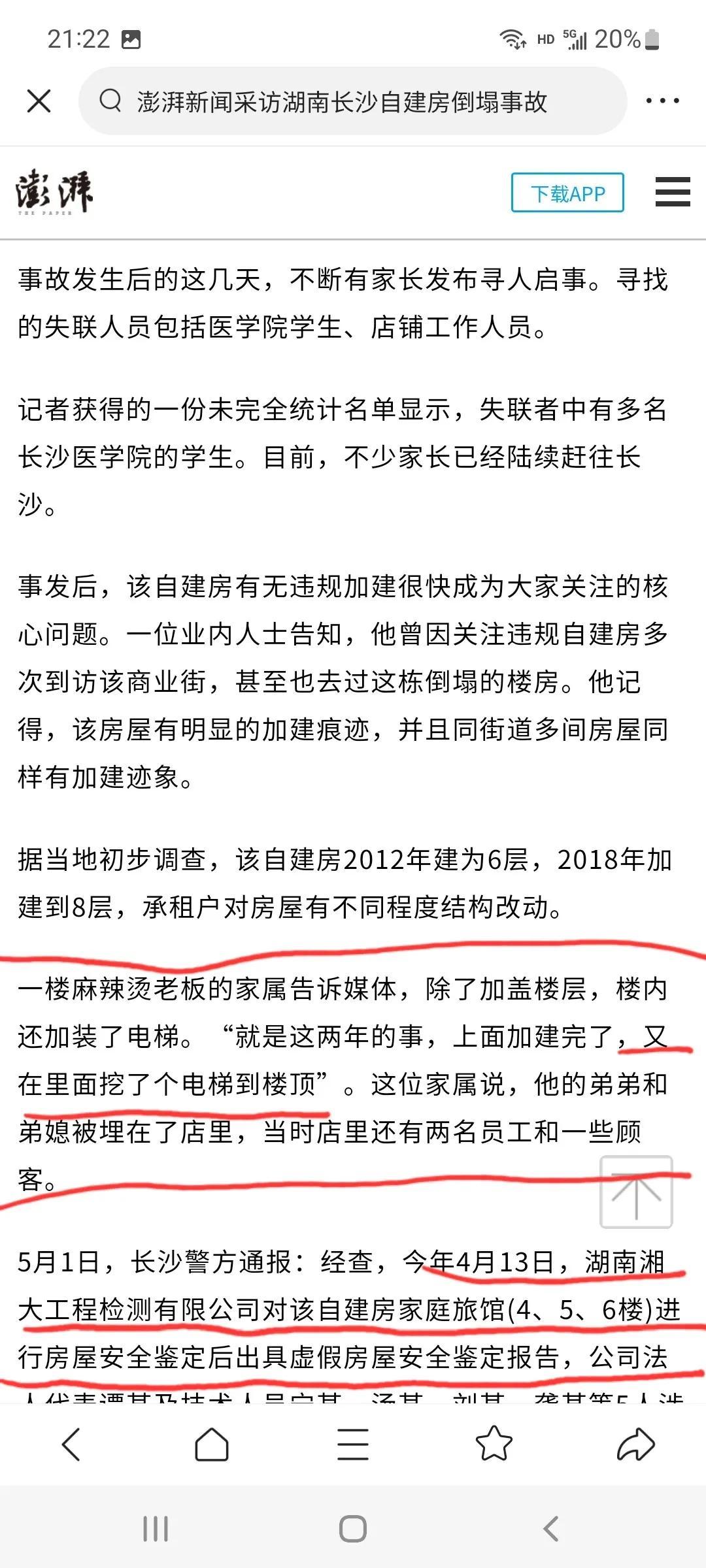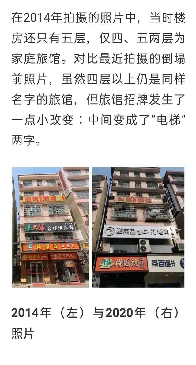 湖南长沙自建房坍塌事故已经过去快一个月时间了,虽然官方调查报告还没有出来,但是我从公开的媒体采访报道中还是找到了一些实用信息,首先澎湃新闻采访当时一楼麻辣烫老板的家属,他告诉记者房子里面挖了个电梯到楼顶,而长沙警方在通报中说明湖南湘大工程检测有限公司在今年四月十三号对4-6楼的家庭旅馆进行了房屋安全鉴定后出具了虚假的鉴定报告,对比事故发生前后的图片我们可以看出,原来四楼的爱家家庭旅馆事故前已经变成了爱家电梯旅馆,并且从原来的四楼五楼变成了四五六一共三层楼,由此可以判断湖南湘大出具的检测报告应该是针对于四到六楼由于加装电梯造成的房屋结构的改变的需要而做出的检测。