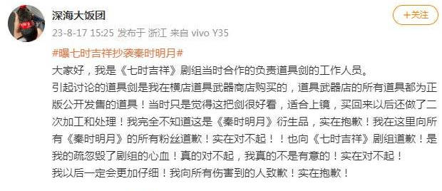 有网友曝《七时吉祥》抄袭《秦时明月》,不仅道具剑一样,OST歌词也相似。对此,《七时吉祥》负责道具剑工作人员回应称他不知道这是《秦时明月》衍生品,在此道歉。《秦时明月》官方也发声明,称《七时吉祥》剧方并未取得任何关于音乐、影像、道具的授权,保留追究侵权行为法律责任的权利。