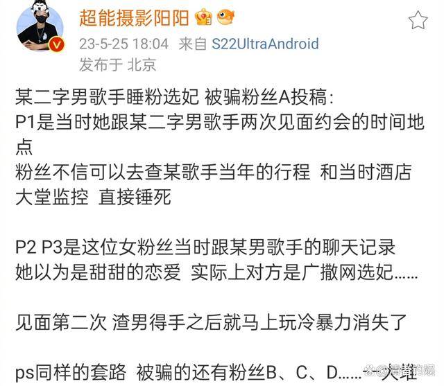 为了表明自己所言非虚,这位狗仔就开始分享了被骗粉丝A某的投稿,A某的投稿说实在的聊天内容蛮平淡的,也没有什么实锤,A某口述的一些事情倒是比较劲爆,不过也是比较欠缺证据的,唯一可以称作为证据的大概就是该女子在某地的开房记录,据悉同一时间某个歌手也是到那了,要是可以查询到大堂监控内容的话,就可以对比一下了,不知道这位阳阳是否已经手拿“铁锤”了呢?