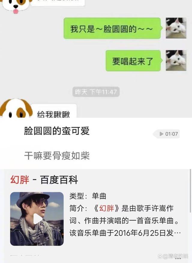 第一种可能是阳阳手中没有实锤,所以只能含糊其辞,怕被人告了,第二种可能就是有实锤,但偏不说出来,让大家猜测,聚集流量,或者也能以此让该歌手团队主动联系他,到时候就不一定可以曝光出来了,第三个就是自己的恶趣味吧。从讯息来看,两人在某年的三月份在上海有了第一次见面。聊天记录中,女方说自己脸圆,也称对方脸圆,然后对比一下网友发现:许嵩有一首歌曲叫做《幻胖》,而且女方给男方画的图片中有一只松鼠照片。