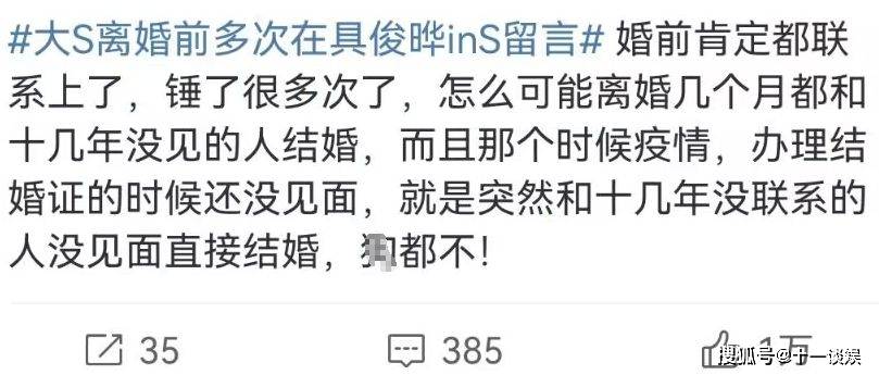 已知汪小菲与大S离婚是在2021年11月22日,但这个疑似大S小号的人,却在2021年7月22日就在具俊晔的账号下留言,称是我本人,随后,小S回应:姐真美,小S这个账号是有认证的,可见不会有假。