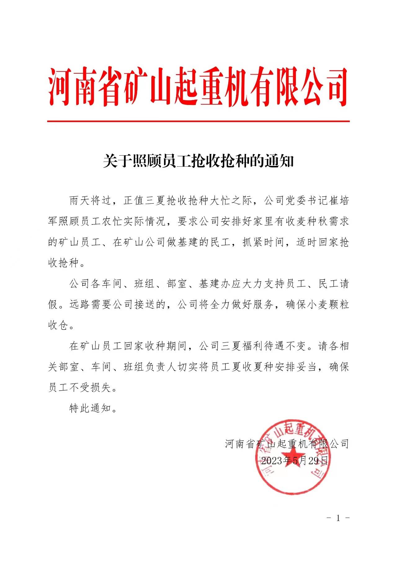 河南省矿山起重机有限公司关于照顾员工抢收抢种的通知