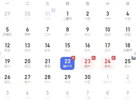 端午节放假安排:6月22日(星期四)至24日(星期六)放假调休,共3天,6月25日(星期日)上班。即法定放假1天,调休1天,休息3天后,再连续上班6天。