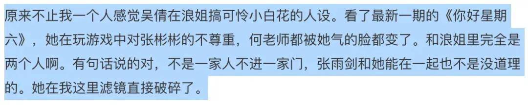 然后在游戏环节表现得太绿茶、对同行嘉宾翻白眼、甩锅别人、情商太低,被网友疯狂吐槽!她在浪姐里面是小白花人设,突然到了星期六里面变成咋咋呼呼口出狂言的大嗓门,让人觉得反差太大,引起强烈反感!