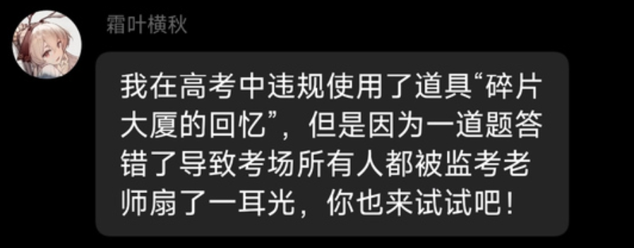 仿佛这样做,就能再次回到那个阳光明媚的普通下午,坐在课桌前,听着老师的粉笔沙沙地划过黑板,静静地望着窗外发呆。毕竟当时的我们想象不到,在多年以后,我们会如何怀念那样一个普通的下午。在多年以后,看着考生忘带身份证的新闻、看着群友花样百出的整活,也许在笑过之后,多多少少还是会感到寂寞吧。