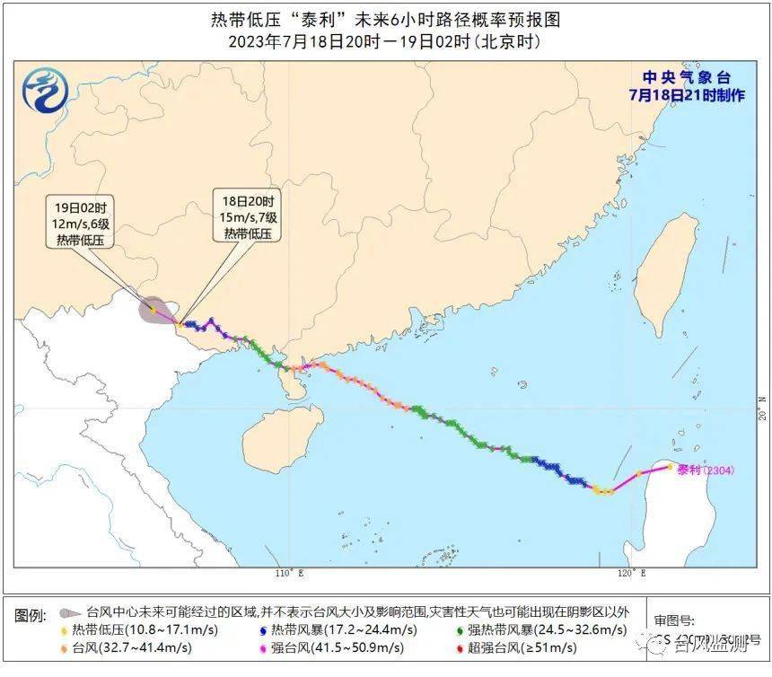 7月18日20时,今年第4号台风“泰利”中心位于北纬22.3度,东经106.8度(位于广西龙州县境内),中心附近最大持续风速15米/秒(7级风,热带低压级),中心最低气压1000百帕。