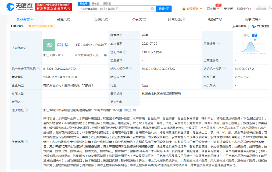而一米八海洋科技(浙江)则刚刚于7月20日成立,是一家以从事渔业为主的企业,经营范围包括水产苗种生产;水产品批发;水产养殖;渔业专业及辅助性活动等。公司注册资本1.1亿元,注册地位于浙江杭州,法人代表为邓中华。