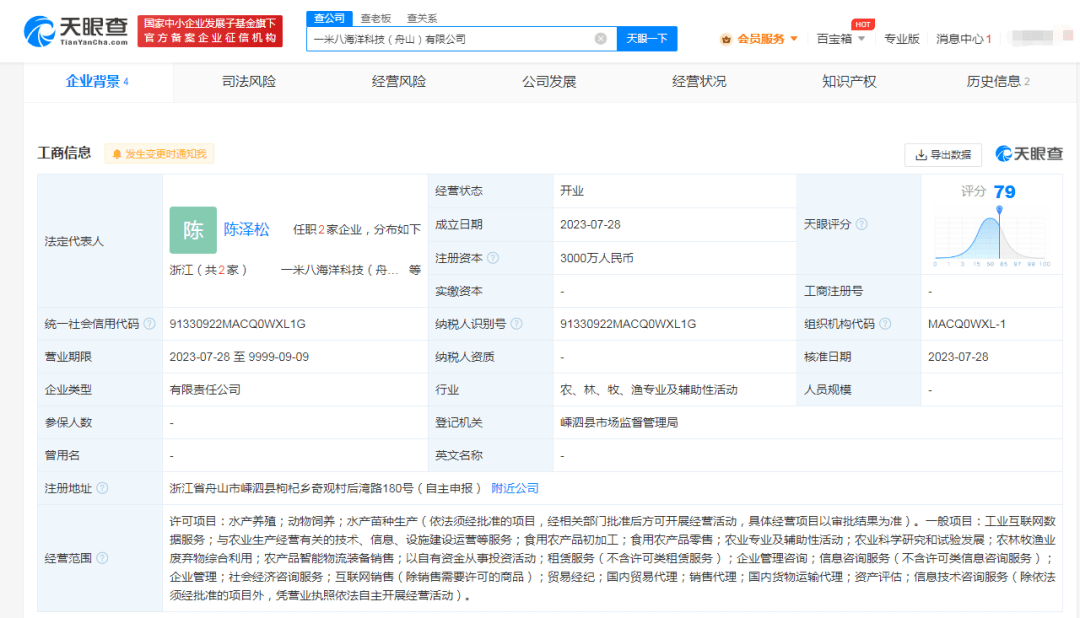 天眼查显示,7月28日,一家名为一米八海洋科技(舟山)的公司成立,注册资本3000万元,是一家以从事农、林、牧、渔专业及辅助性活动为主的企业。股东信息显示,一米八海洋科技(浙江)为该公司控股东。