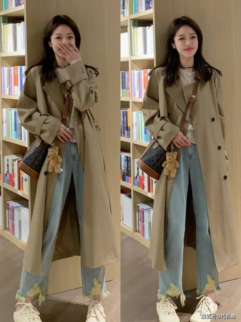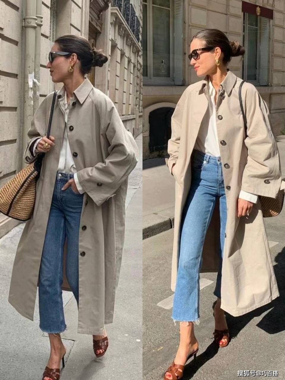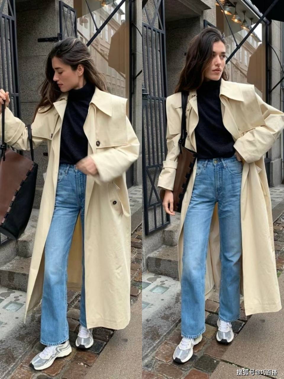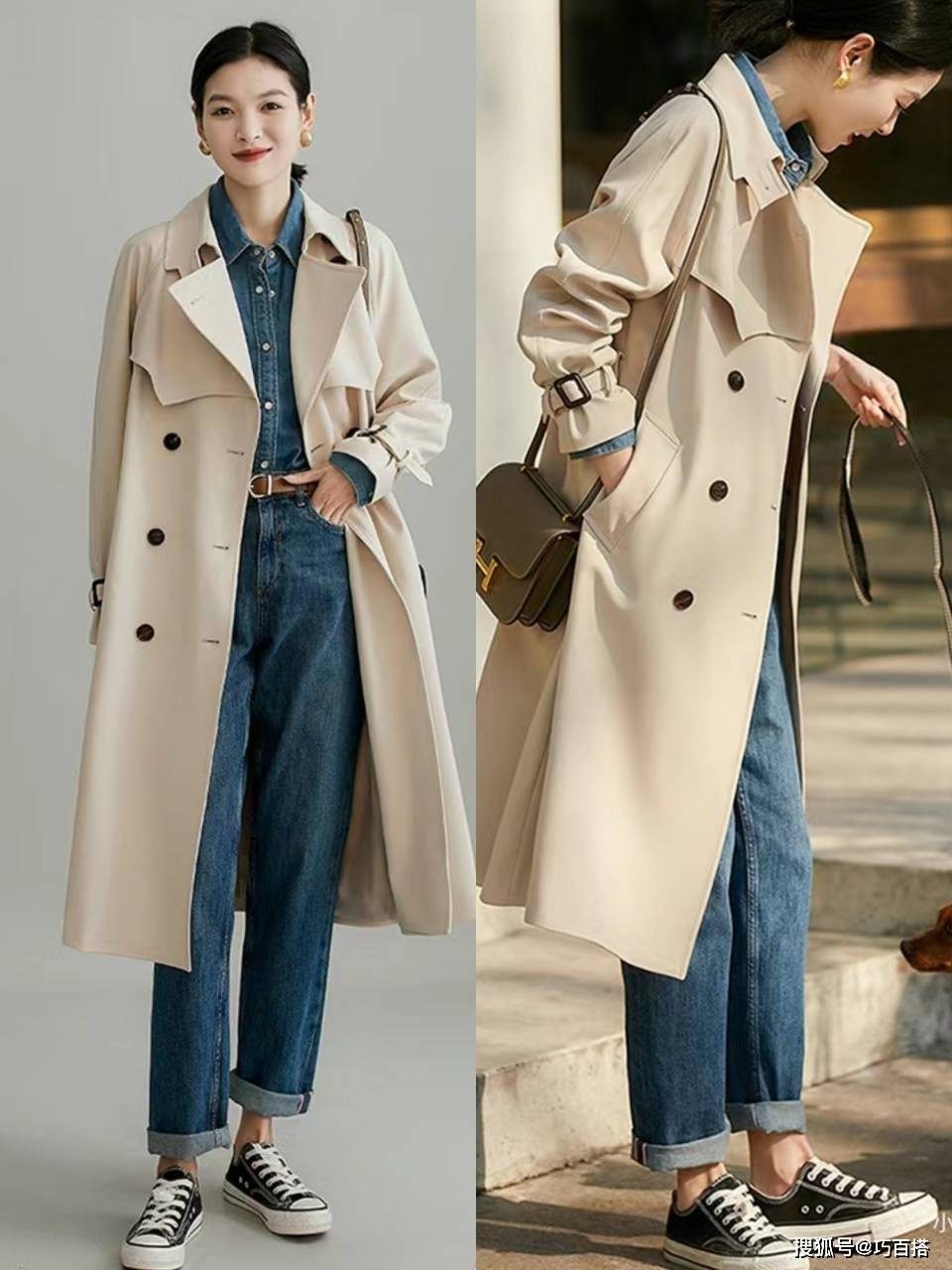 风衣搭配牛仔裤时,大家可以主动选择整体造型不超过三种配色的款,也可以直接选择两种配色的款,内外同色+下装撞色或者上下同色+内外撞色,都是穿的出门、拿得出手的。