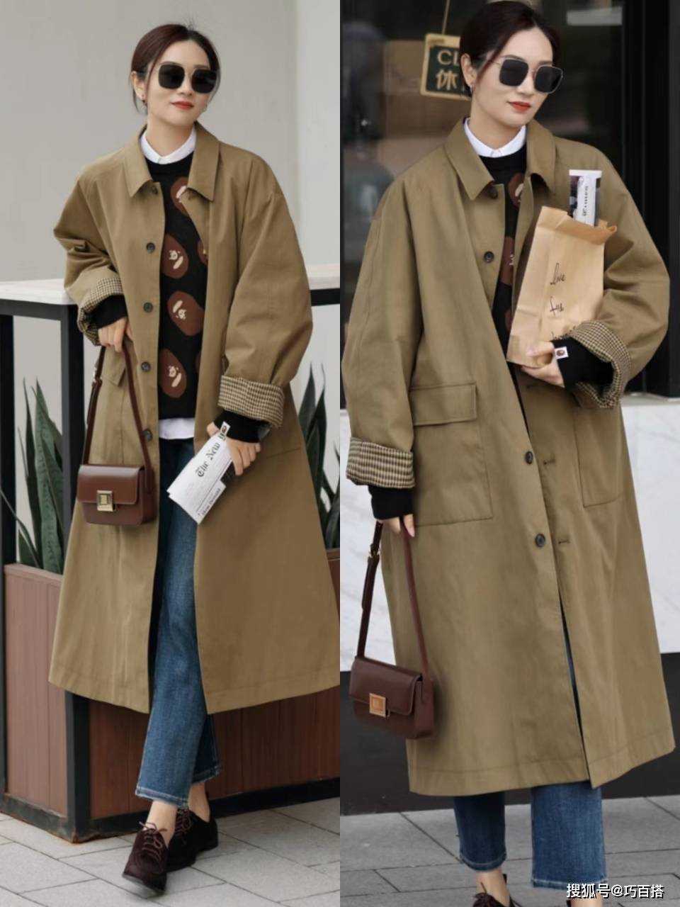 喜欢层次感穿搭的姐妹,也可以走出舒适圈,选用印花针织毛衣、圆领卫衣与风衣搭配,从博主上身效果来看,还是非常不错的。