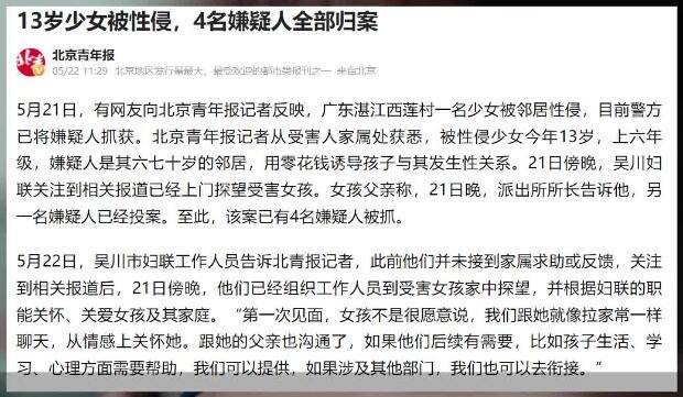 时间:2023-06-27 17:31:00来源:13岁少女疑被性侵3名嫌犯落网 嫌犯均70岁左右令人炸裂!5月21日,广东湛江某村发生了一起令人震惊的性侵案件。一名13岁的少女疑遭到同村邻居男子的性侵,案件引发了公众的广泛关注和谴责。据报道,家属已报案,警方已经抓获了嫌疑人,其中一个嫌疑人是其约70岁的邻居,其余三人也同是邻居,都是姓龙且年龄都在70岁左右。其中两人实施了强奸行为,另外两人实施了猥亵行为。21日晚上,最后一名嫌疑人已于21日晚11点到当地派出所自首。