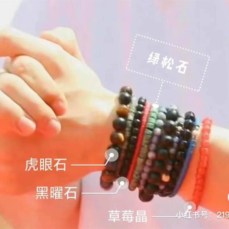 来看看小白都戴了什么?黑色反金光的是虎睛石,黑色的像黑曜石、绿色的是绿松石等等。还有粉色的网友说像草莓晶,不过我觉得像红纹石。不管是什么材质,一个大男生戴粉色宝石就值得令人深思。毕竟粉色系玉石主打招桃花,很难不让人怀疑,白敬亭是怕戴粉色手链太突兀,才戴了那么多别的手链来转移视线。