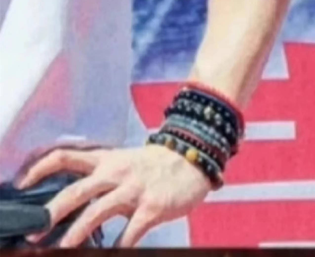 另外就是他的手串了,真的很难让人不注意。我从没有见过一只手上戴了这么多手串,有时候还是两只手都戴满了。仔细数了一下,好像是11条手串。有时候11条都戴在一只手上,有时候分开戴在两只手上。不知道这个重量的手,他抬起来费不费劲。