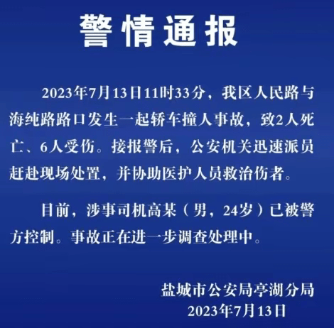 记者了解到,事发地址人民路与海纯路路口位于江苏盐城第二中学门口附近。据学校方面工作人员称,现在正值暑假,学校没有师生在。